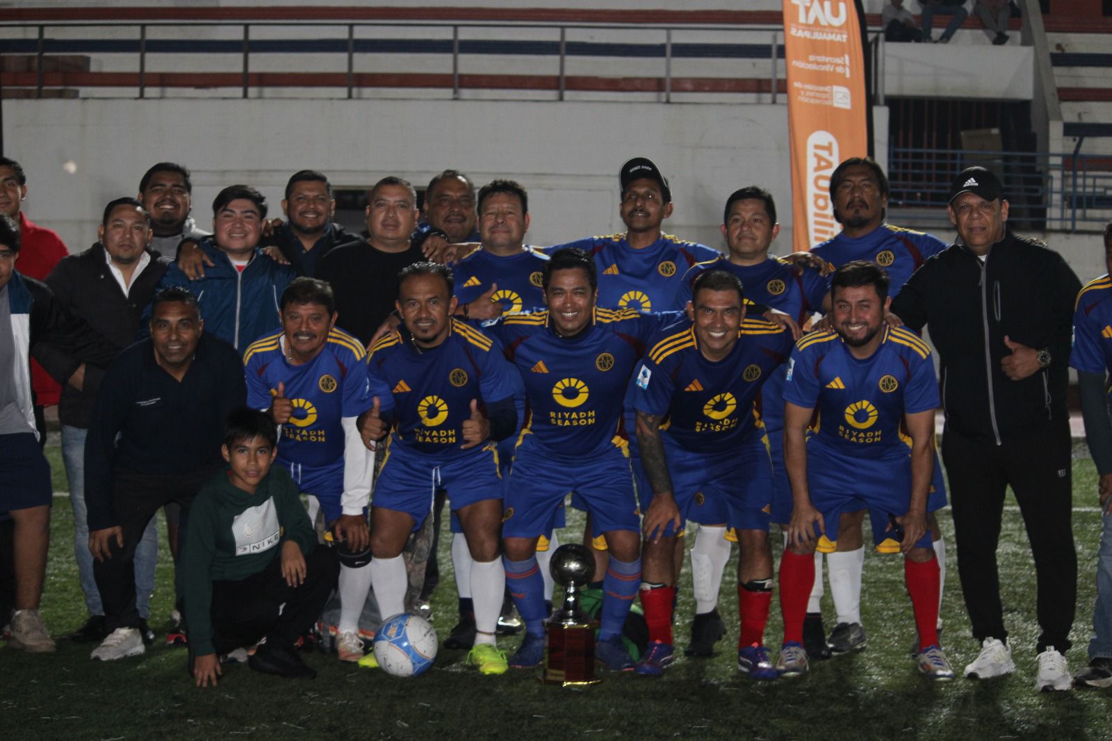 Victoria, Tamaulipas.- Con marcador global de 5-4, Pedacera SUTUAT se proclamó campeón en la Categoría Master del Futbol 7 para Funcionaros, Maestros y Empleados del Centro Universitario Victoria, de la Universidad Autónoma de Tamaulipas, venciendo en la final a Cuernos Largos de la Facultad de Medicina Veterinaria y Zootecnia, por la vía de los penales.